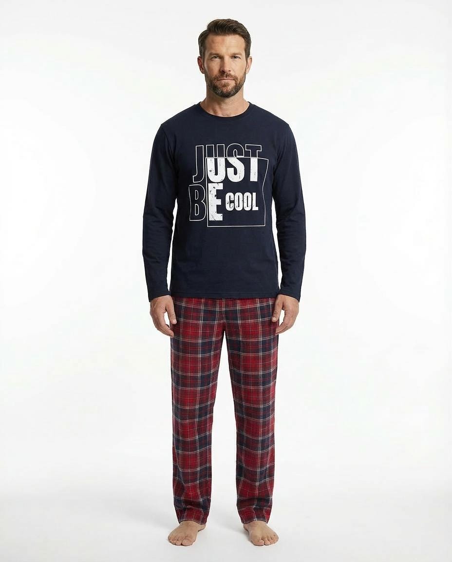 Men’s Navy & Red Cotton Pajama Set – Long Sleeve Top & Plaid Pants
