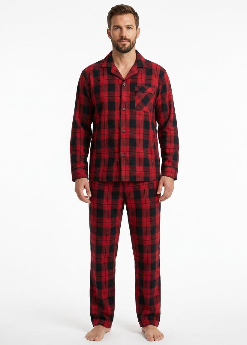 Men’s Winter Cotton Pajama Set – Long Sleeve Top & Plaid Pants
