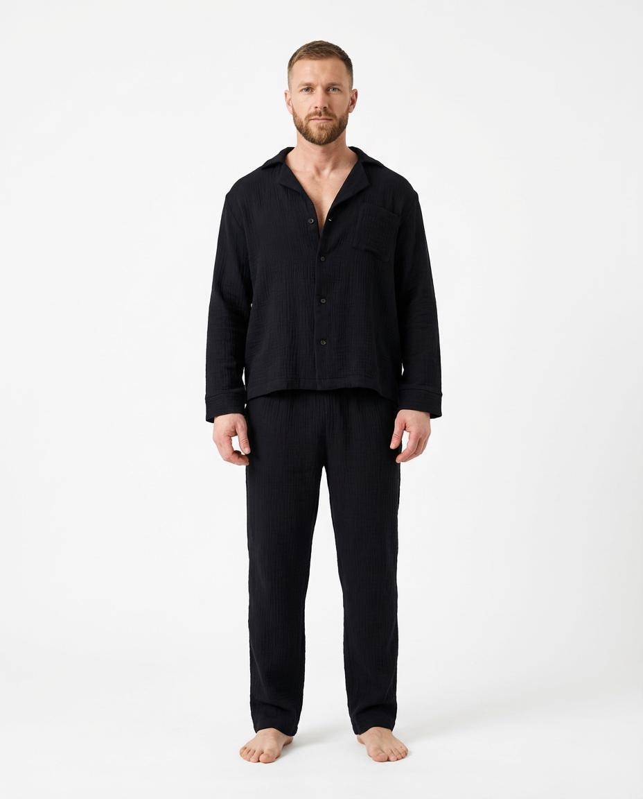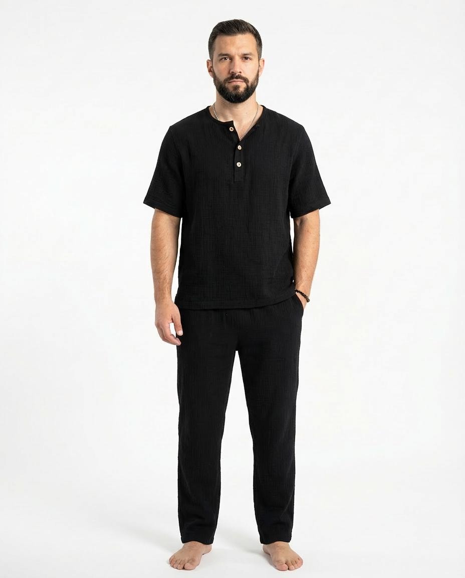 Men’s Black Muslin Pajama Set – Double Layer Button Shirt & Pants