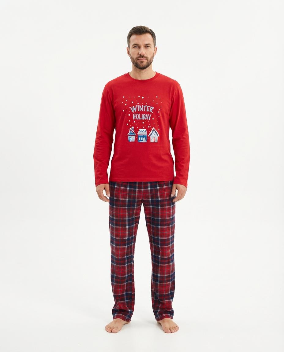 Men’s Christmas Pajama Set – Red Long Sleeve Top & Plaid Pants with Pockets