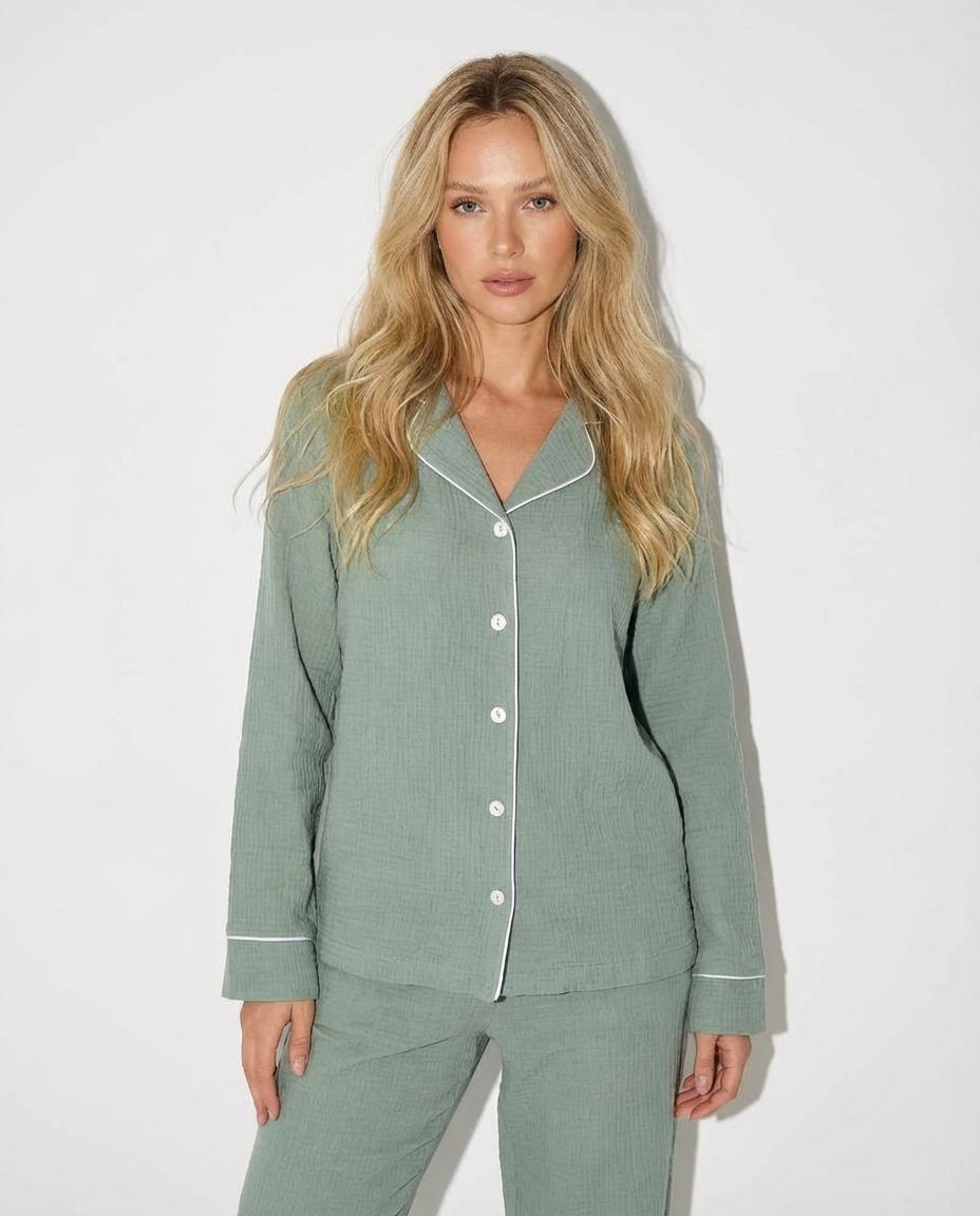 Women’s Green Muslin Pajama Set - Button-Up Shirt & Pants