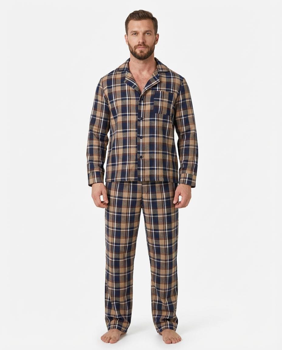 Men’s Warm Winter Blue & Brown Pajama Set with Pockets